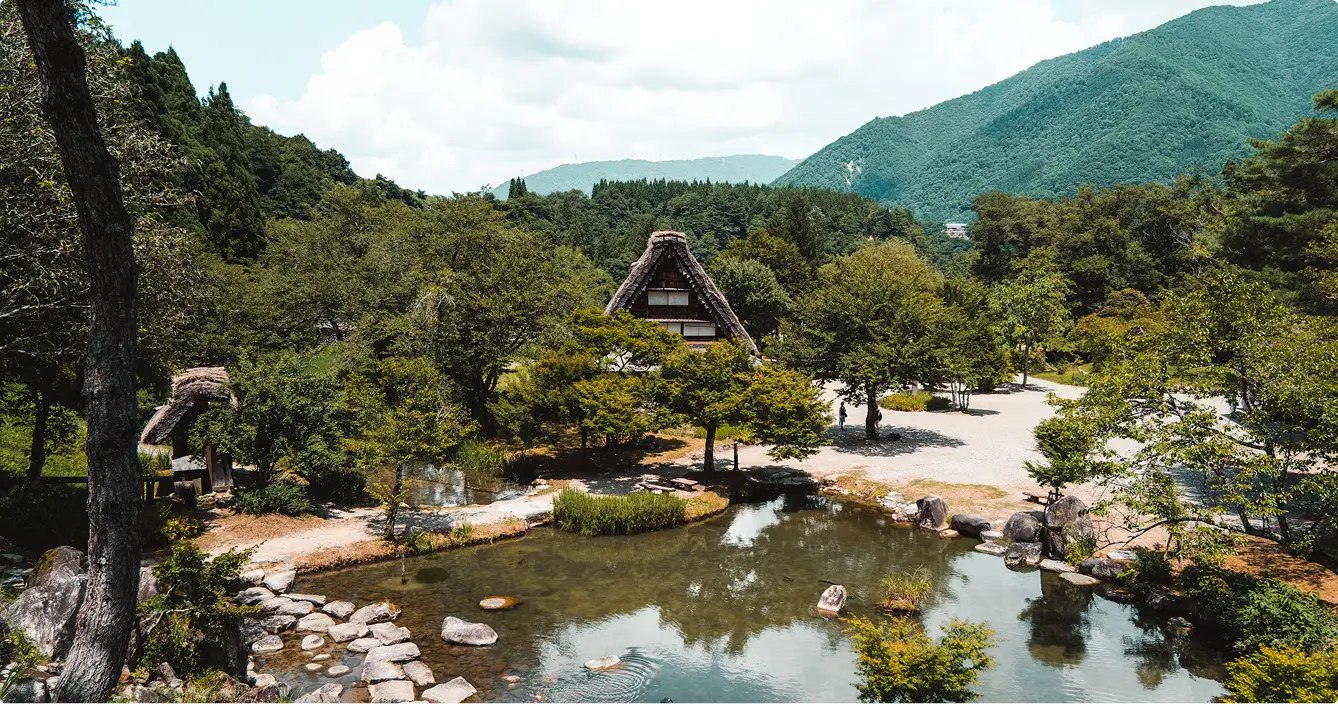 De Gassho-stijl boerderijen, met hun unieke steile rieten daken die lijken op gevouwen handen in gebed, vertellen het verhaal van eeuwenoude architectuur die perfect is aangepast aan de weelderige bergachtige omgeving.