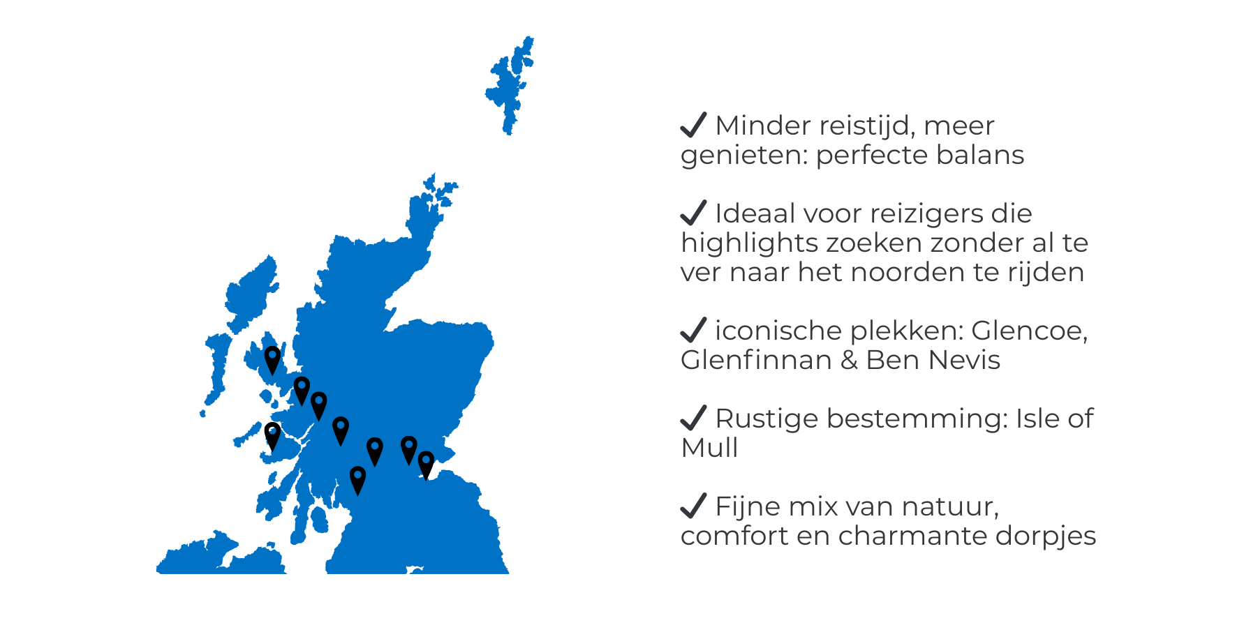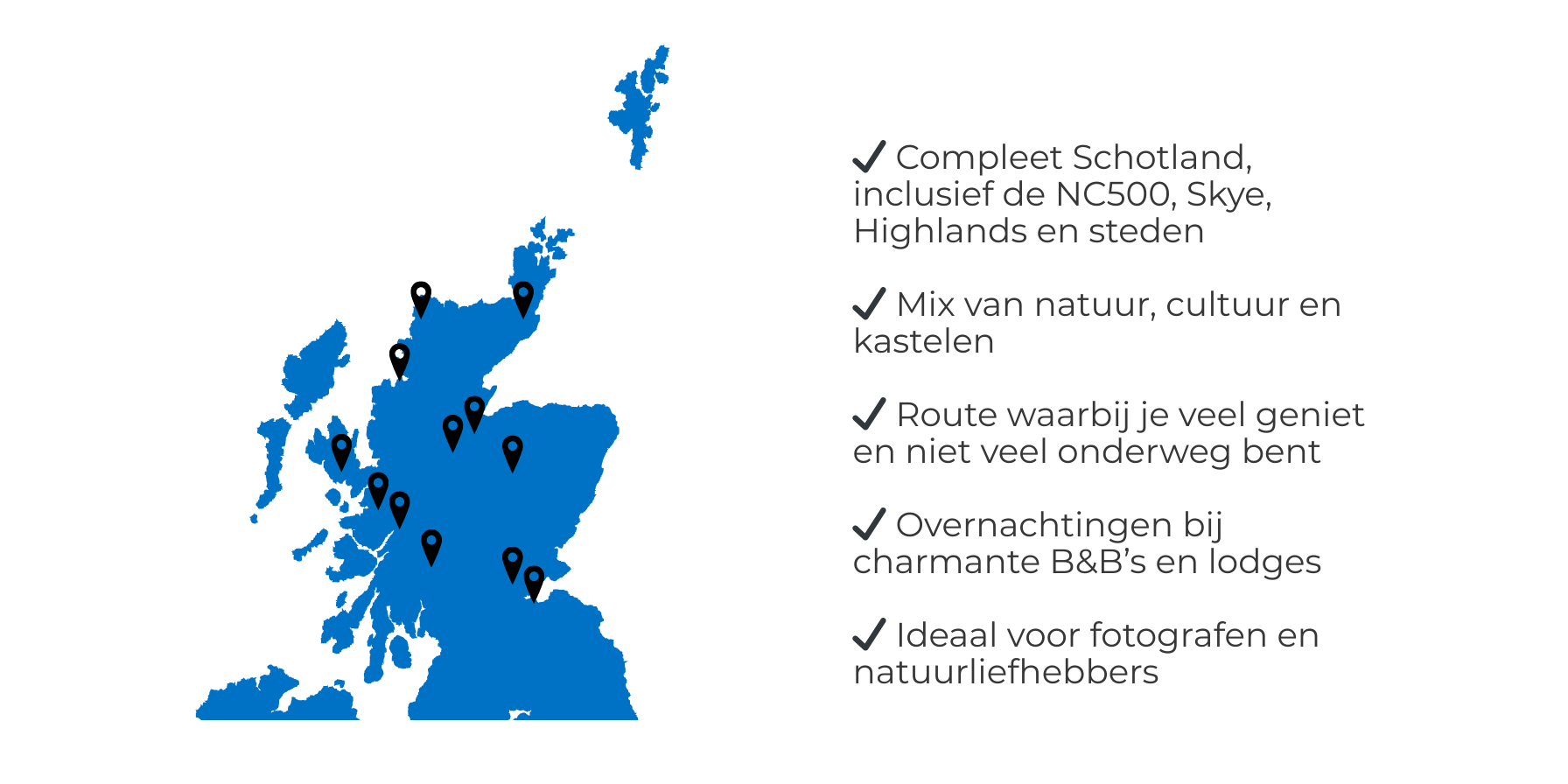 Een Schotland reis is een reis waar ruige natuur, eeuwenoude geschiedenis en legendarische gastvrijheid samenkomen. Of je nu houdt van bruisende steden, sfeervolle dorpjes of adembenemende landschappen, Schotland heeft voor ieder wat wils.